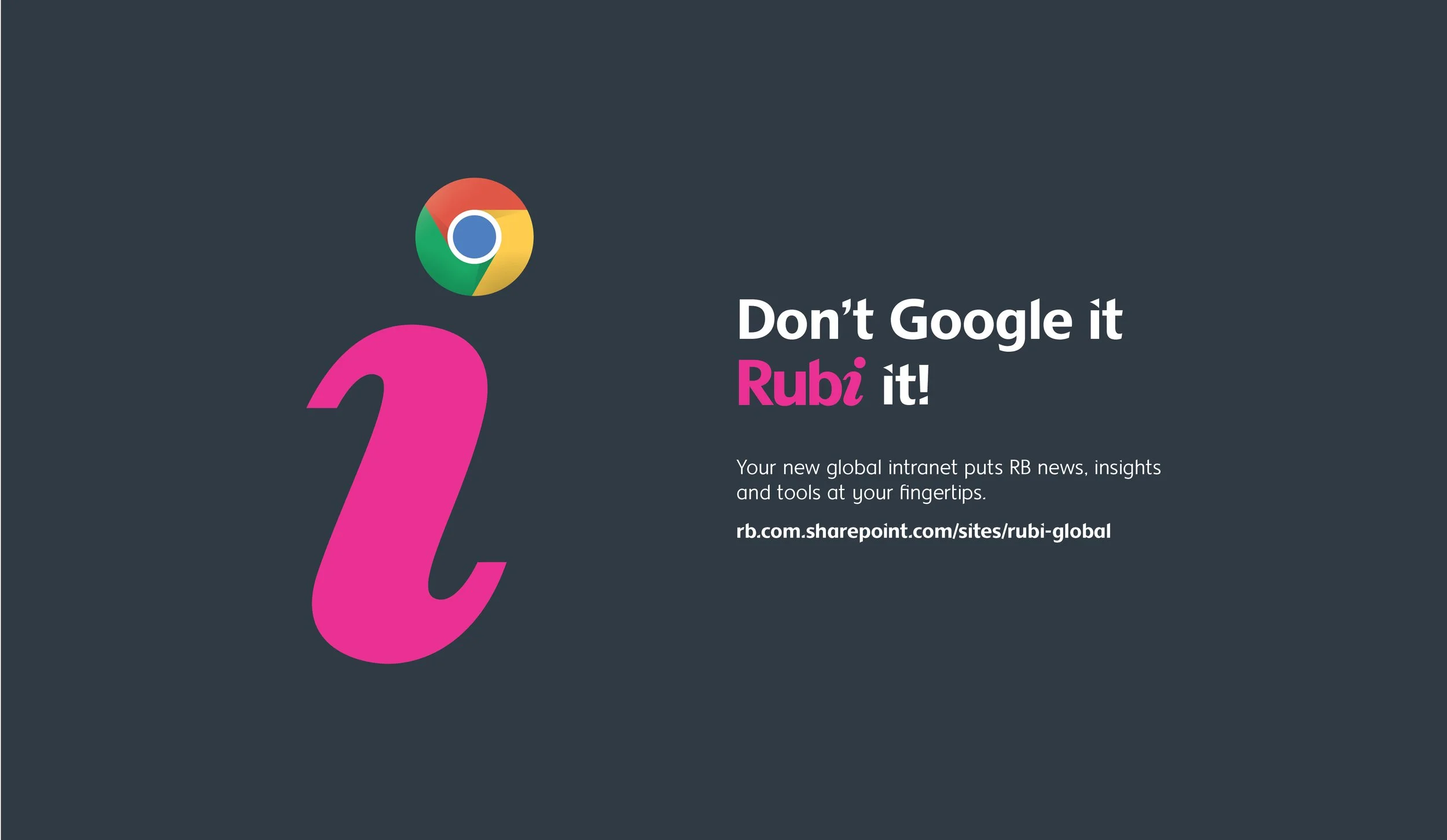 Rubi was created as Reckitt Benckiser’s new intranet, a global tool designed to help employees across 40 offices find and share useful information and inspiring stories. This one-stop shop needed an identity that felt fresh and engaging while aligning with RB’s existing brand.